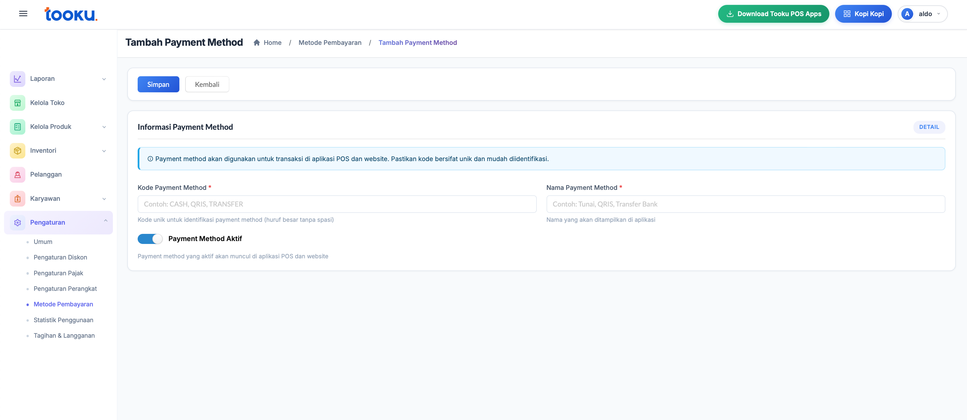 Aktifkan toggle Payment Method Aktif agar metode bisa digunakan saat transaksi.