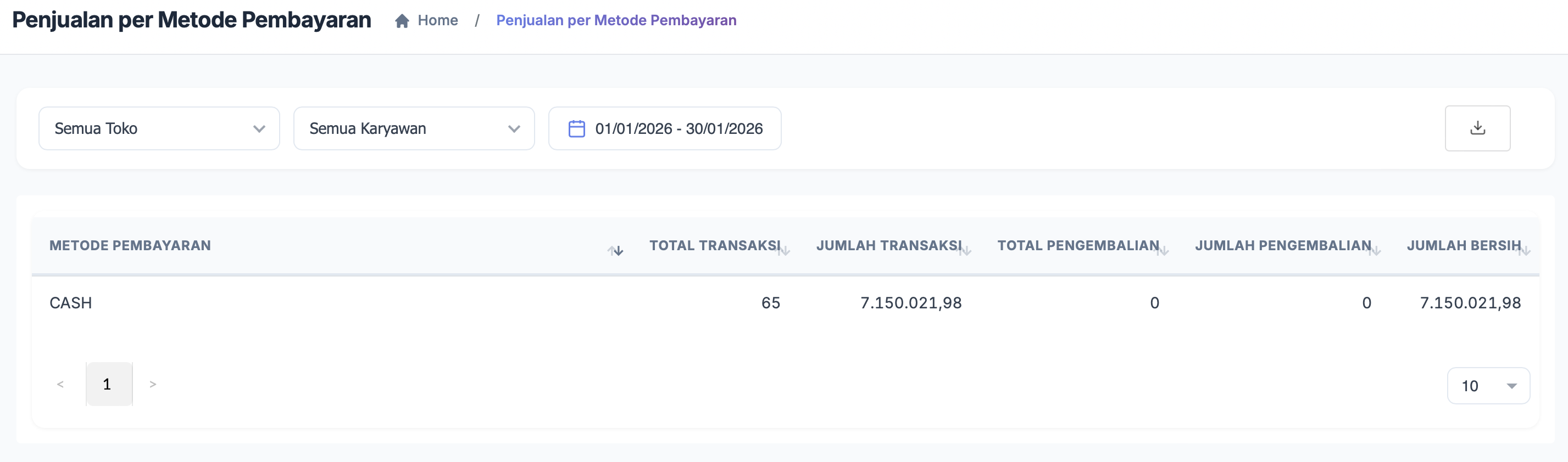 Halaman Penjualan per Metode Pembayaran menampilkan ringkasan transaksi berdasarkan jenis metode pembayarandalam periode yang dipilih.