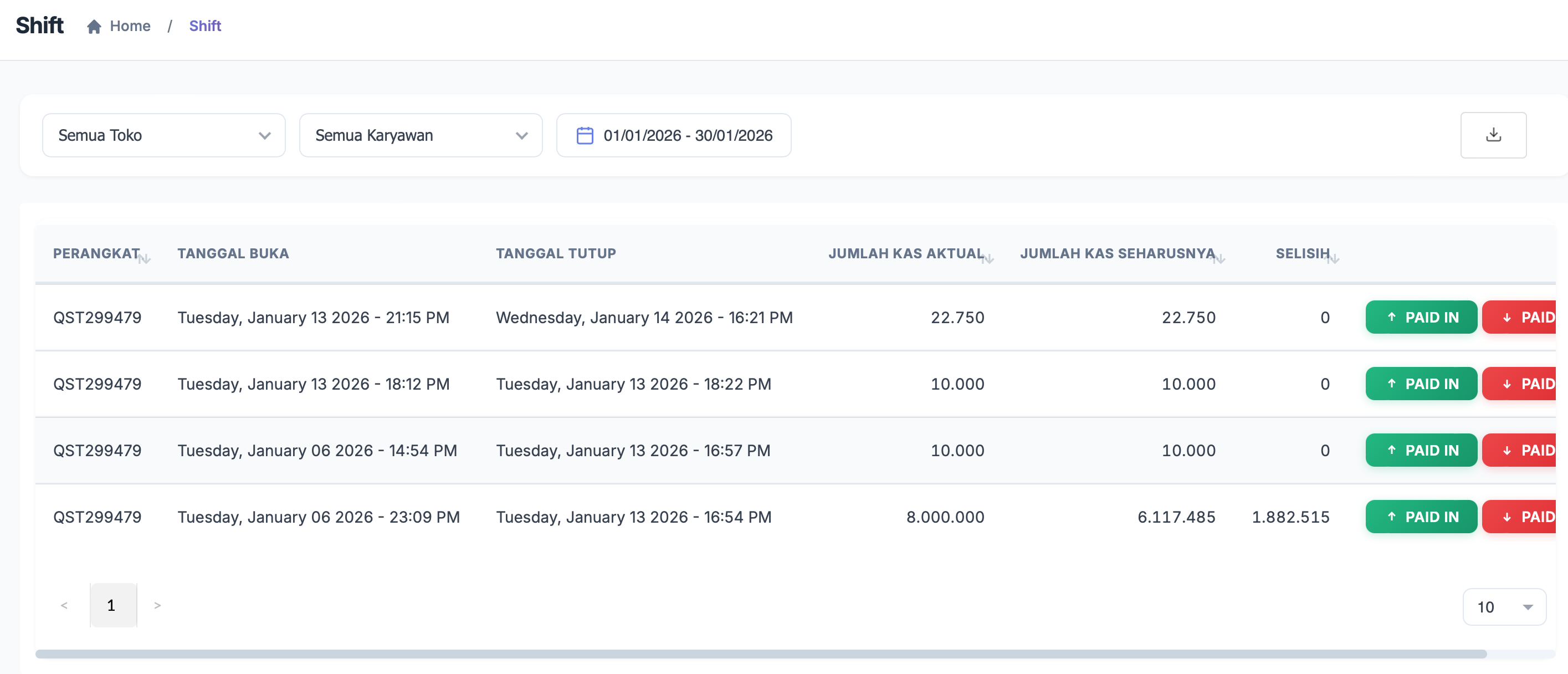 Halaman Shift menampilkan semua sesi buka–tutup kasir pada setiap perangkat dalam periode tertentu.