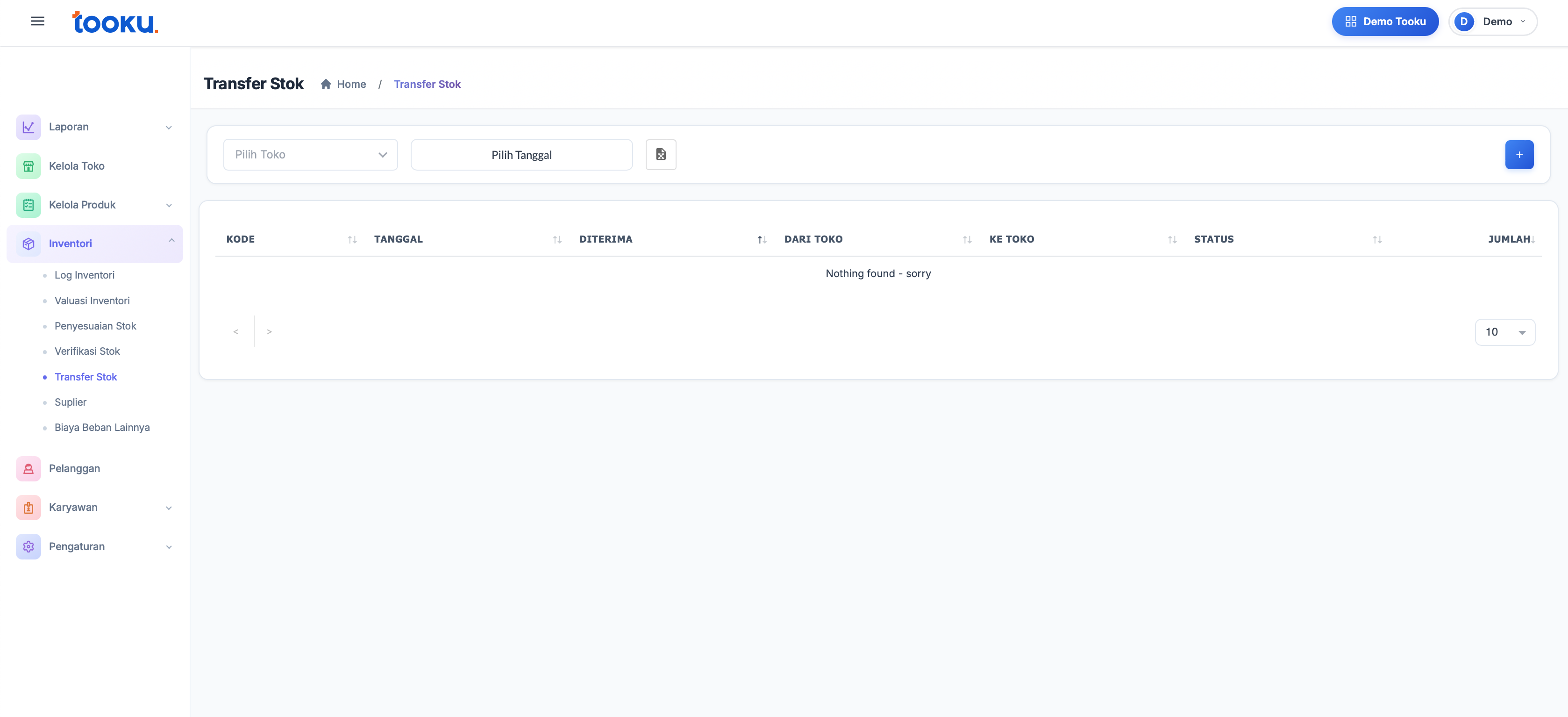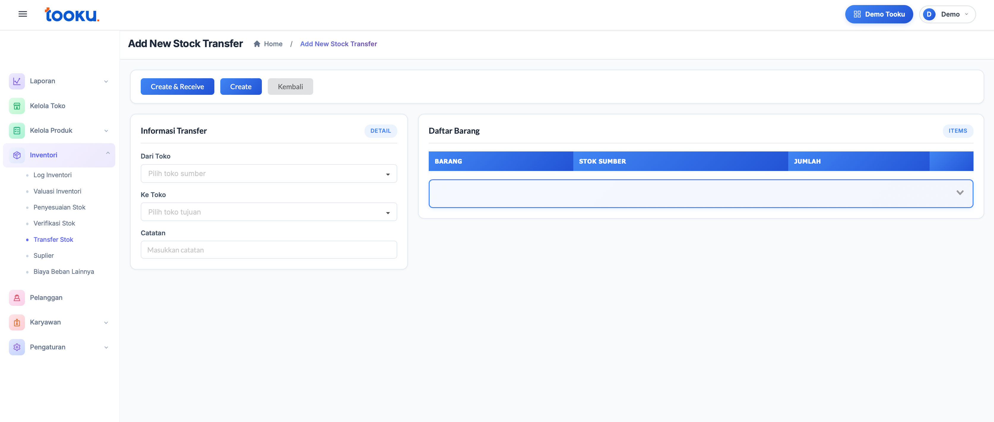 1. Masuk Inventori → Transfer Stok